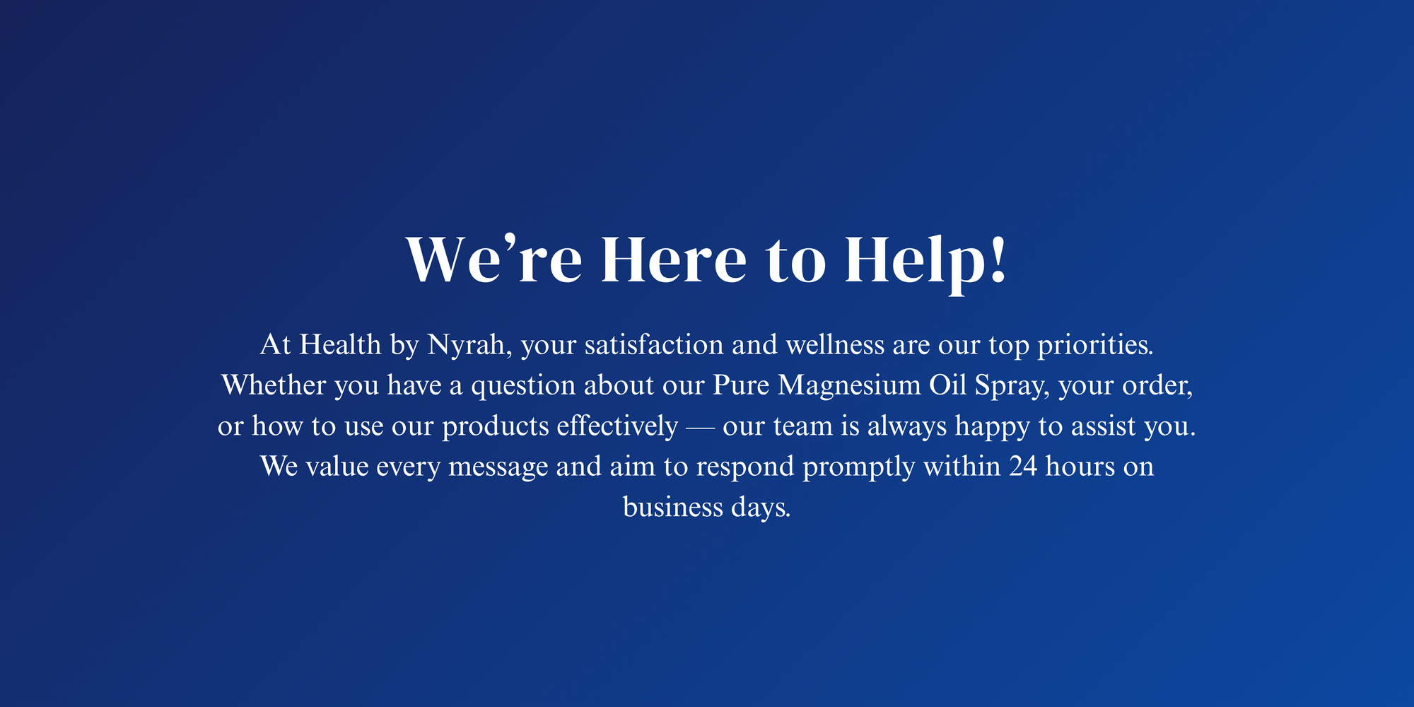 Email:support@healthbynyrah.comBusiness Hours: Monday – Friday, 9:00 AM – 6:00 PM (PST)Response Time: Within 24 hours